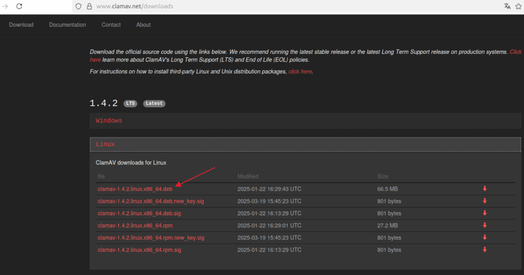 Selecteer de juiste versie die past bij jouw linux distributie. In ons geval, op onze Freeware PC maken we gebruik van Ubuntu, kiezen we voor ‘clamav-1.4.2.linux.x86_64.deb’.