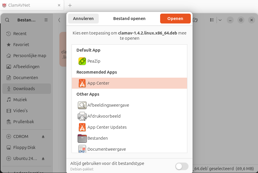 Hier klikken we met de rechter muisknop op het zojuist gedownloade bestand en selecteren ‘Open met App Center‘.
