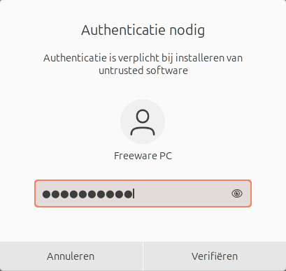 En, omdat linux soms overdreven veilig wilt doen, dien je bij de installatie van een derde partij nogmaals te bevestiging dat het veilig is om deze software te installeren. Voer je wachtwoord in en klik op ‘Verifieren‘.