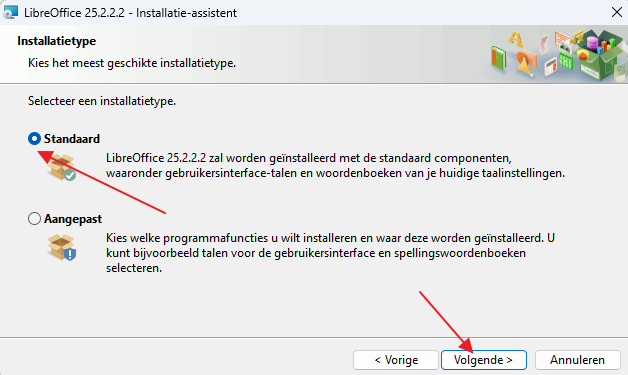 Men kan vervolgens kiezen voor de ‘Standaard‘ installatie of voor een ‘Aangepaste‘ installatie.