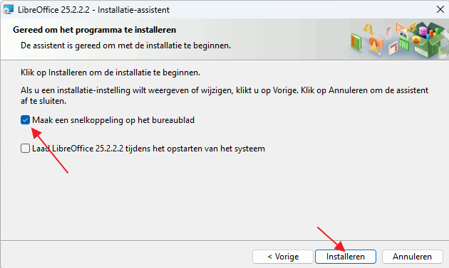 Wij kiezen ervoor om wel een icoon te laten plaatsen op de desktop maar we willen niet dat LibreOffice meteen bij het opstarten van Windows 11 geladen wordt.