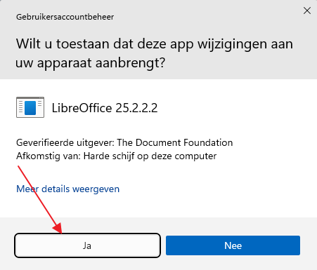 Klik hier op ‘Ja‘ om verder te gaan met de installatie van LibreOfiice.