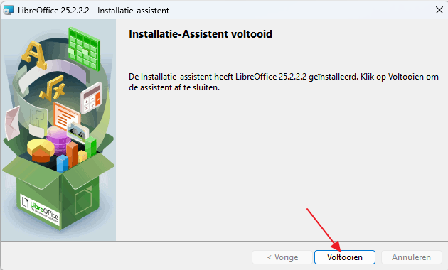 De installatie zal nu worden uitgevoerd en afgerond. Wanneer de installatie geheel is voltooid zal dit worden weergegeven. Klik op ‘Voltooien‘ om het laatste scherm van de installatie van LibreOfiice te sluiten.