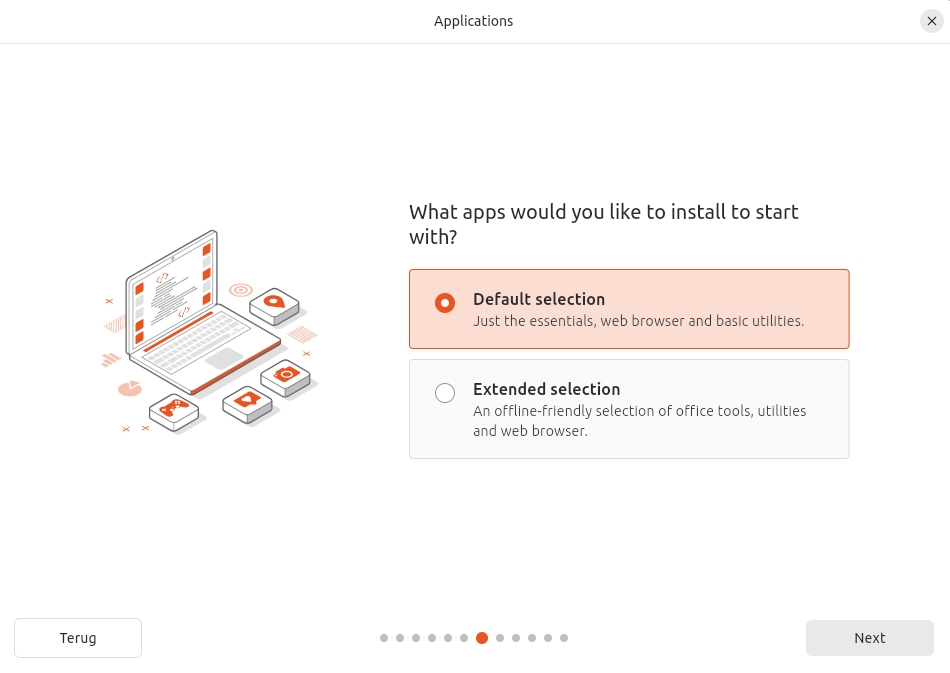 Nu wordt gevraagd welke applicaties je wilt installeren. Wij kiezen hier de standaard selectie maar het staat je natuurlijk vrij om hier vanaf te wijken.