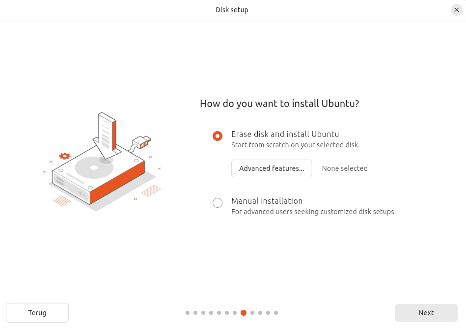 Daarna wordt gevraagd hoe je Ubuntu wilt installeren. Wij kiezen voor “Erase disk and install Ubuntu“.