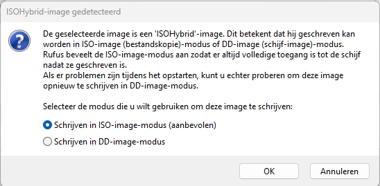 Klik vervolgens op “Start“. Er zal nu de vraag komen in welke modus je dit image wilt schrijven. Selecteer ISO-image-mode.