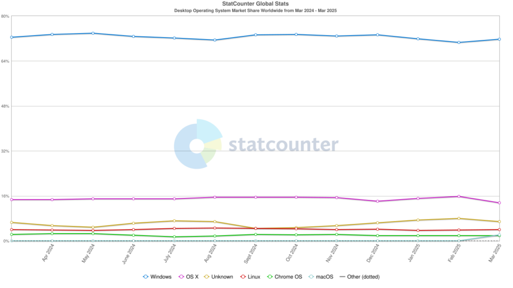 Veruit het meest gebruikte besturingssysteem op PC’s, zowel thuis als zakelijk, is het Microsoft Windows OS. Hieronder is te zien welk markaandeel een specifiek Desktop/Laptop OS heeft: